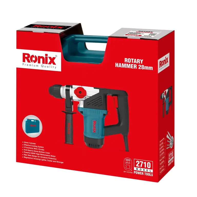 بتنکن 28 میلیمتری 2710 رونیکس، مجهز به موتور گیربکسی و قدرتمند 900 وات است که سرعتی بالغ بر 980 دور بر دقیقه و تعداد 3850 ضربه بر دقیقه را ایجاد میکند. مجموعه ابزارگیر چهارشیار این دستگاه، به ظرفیت 28 میلیمتر و مناسب برای سطوح چوبی، فلزی و بتنی طراحی شده است.