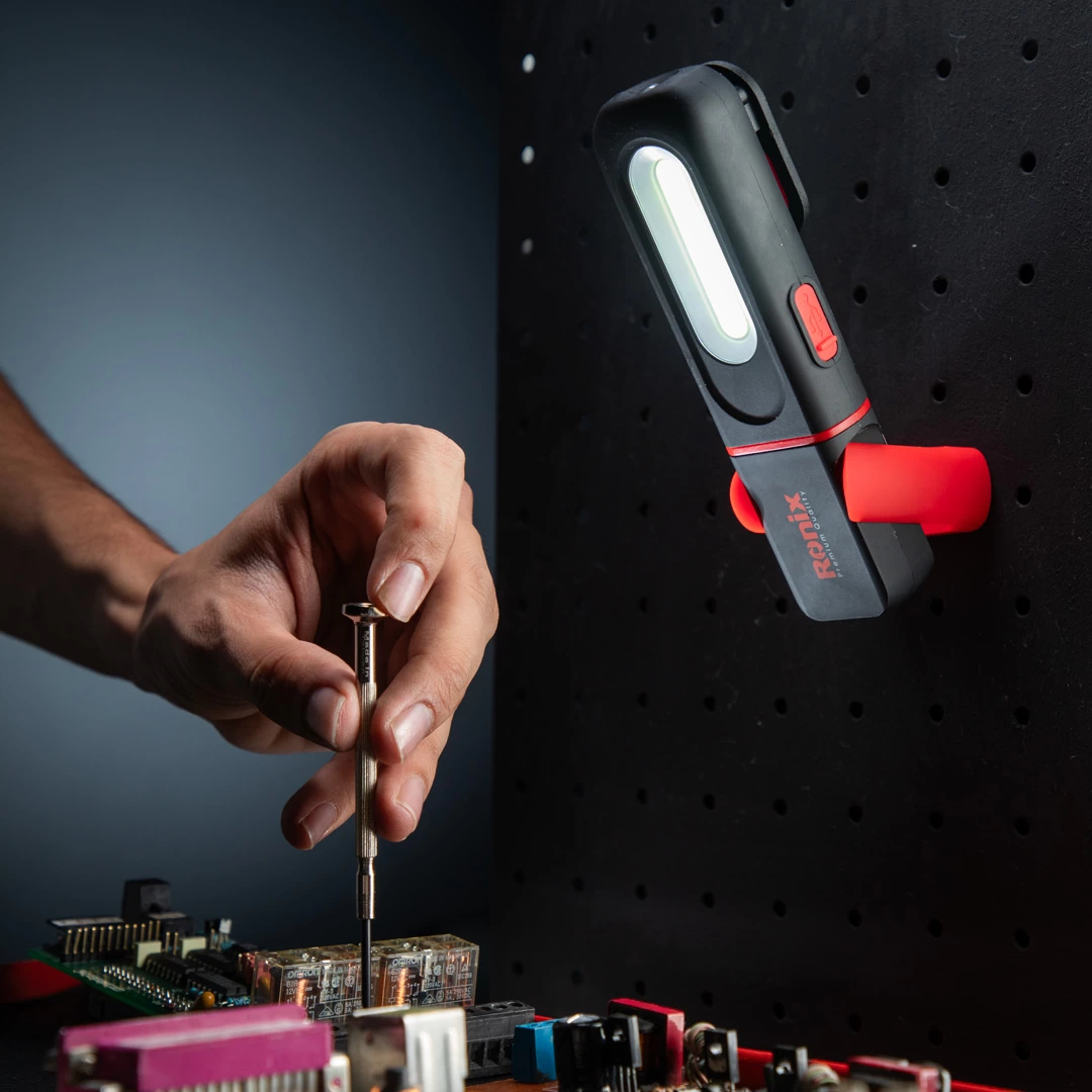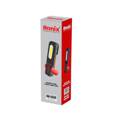 چراغ کار شارژی RH-4226 رونیکس، ابزار روشنایی کارآمدی است که فضای کمی را اشغال میکند و پایه مگنتی آن روی سطوح فلزی میچسبد.