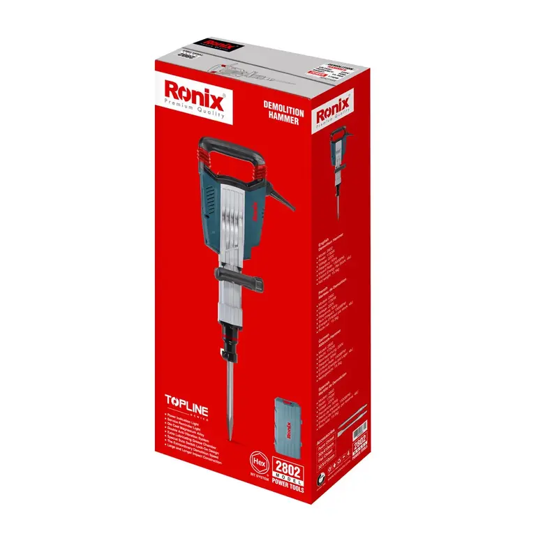 چکش تخریب 14 کیلویی 2802 رونیکس، مجهز به یک موتور 1750 واتی و متشکل از آرمیچر و بالشتکهای صنعتی است. مجموعه عملکرد موتور و مکانیزم ضربهزن، قدرت ضربه 48 ژول و تعداد 1500 ضربه در دقیقه را تولید میکند. در نتیجه، عملیات تخریب با سرعت و دقت فوقالعادهای انجام میشود. در طراحی این دستگاه از ابزارگیر ششگوش HEX استفاده شده است که با قدرت بالایی عملکرد تخریب را انجام میدهد.
